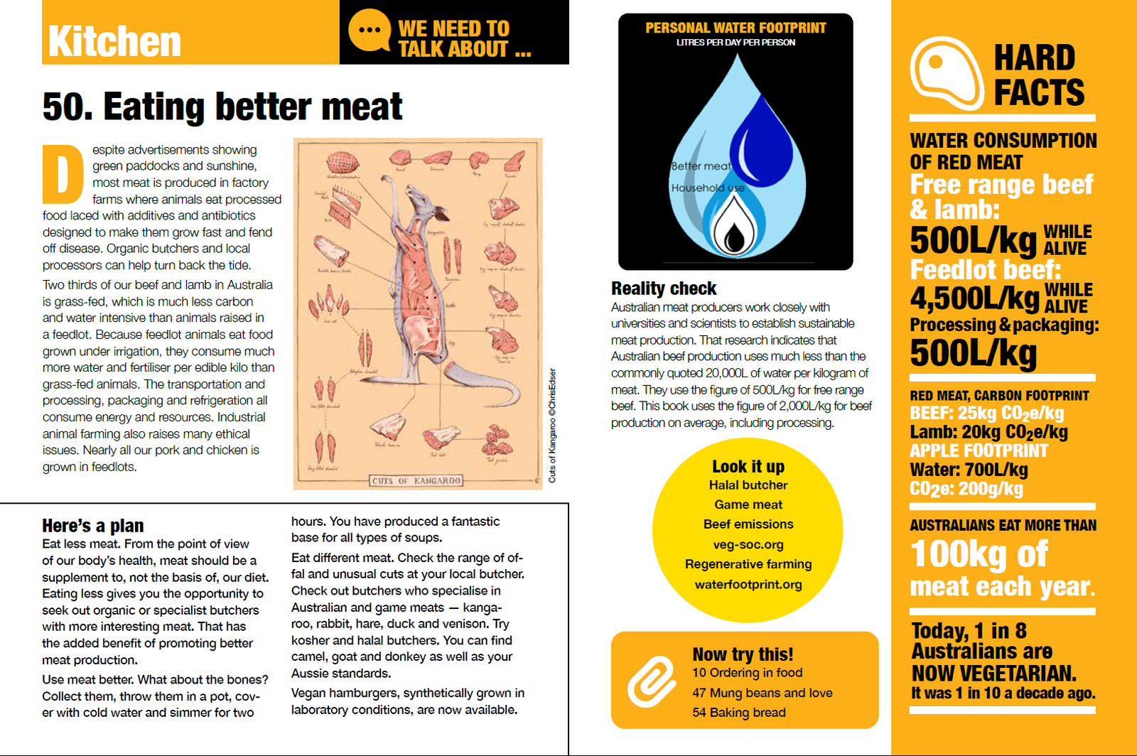 Eat different meat. Check the range of offal and unusual cuts at your local butcher. Check out butchers who specialise in Australian and game meats — kangaroo, rabbit, hare, duck and venison. Try kosher and halal butchers. You can find camel, goat and donkey as well as your Aussie standards.