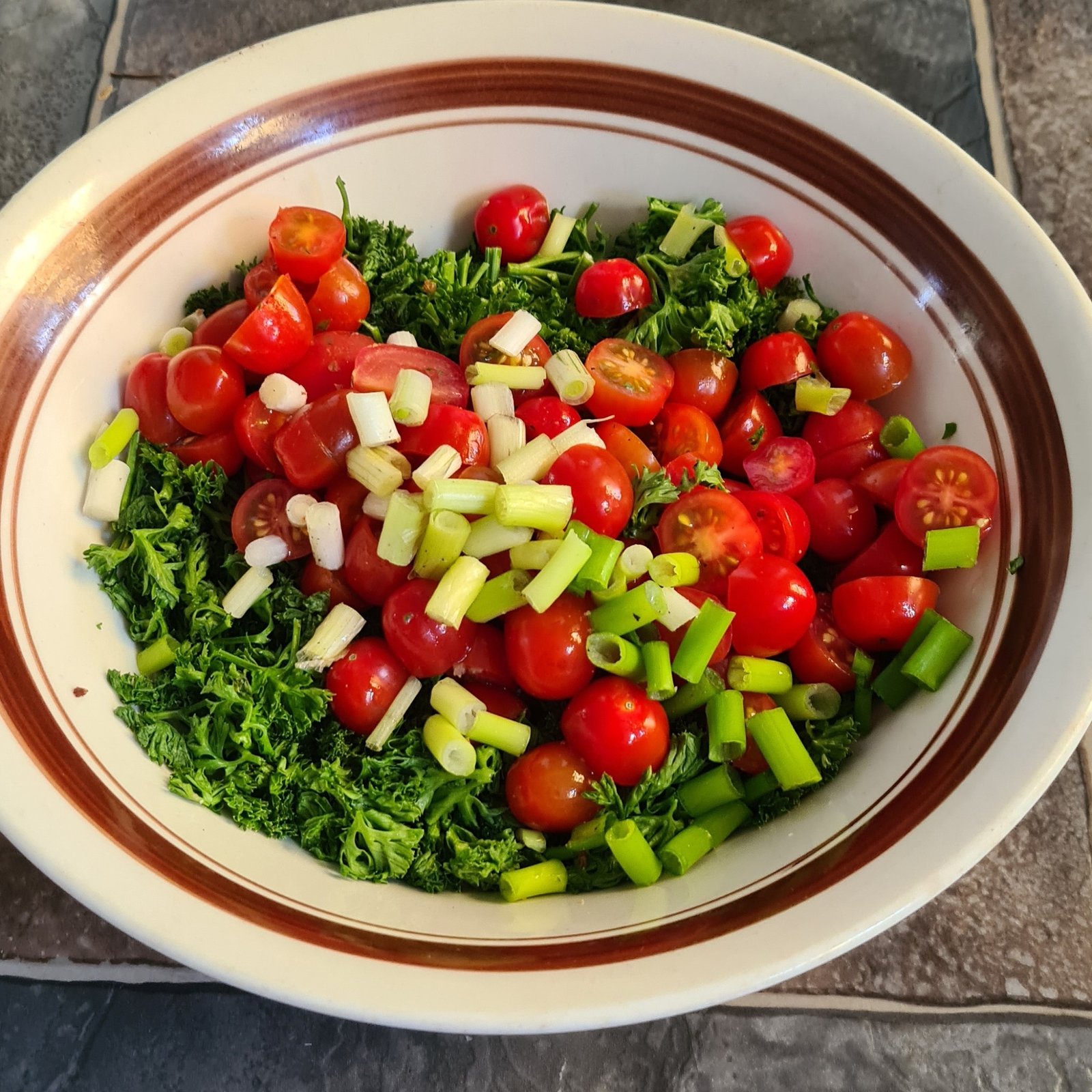 The seasonal tabbouleh depicted here, is made from those cherry tomatoes, self seeded in the first compost spread by a first time gardener. The parsely and the spring onions are in season and saved from food waste, by a local food-rescue collective. I used the spring onions because locally, garlic is out of season. Instead of using burghul to extend the salad, I grabbed some rescue cauliflower and gave it a quick bash in the food processor. I made a dressing from olive oil, some kombucha that has gone to vinegar and fresh oregano. I was a bit surprised when the kombucha vinegar fizzed and popped out of the bottle I was shaking the dressing in, so I used that vinegar to start a KimChi using rescue cabbage.