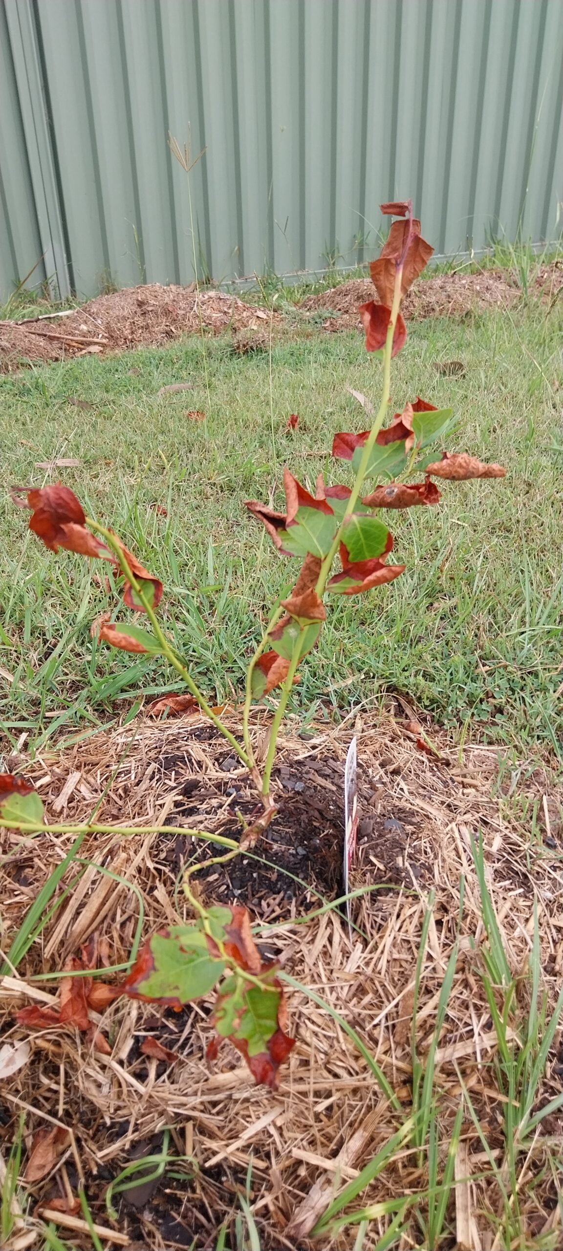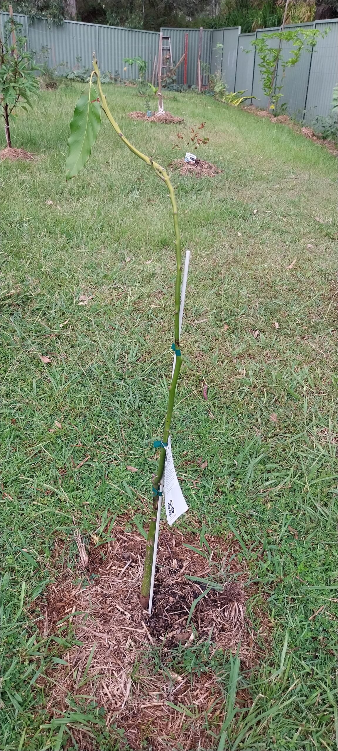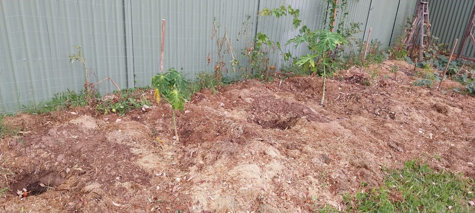 In the background, a row of cherry tomatoes (nearly finished), a grape vine, malabar spinach, and a pumpkin (near the ladder) clamber up a wire fence, placed about a metre in front of the steel fence to keep the weight, the water and the wear and tear off the steel fence which is relatively new and very expensive. They are also planted in holes in the original clay, with lots of organic matter buried in the holes. While each of the existing plants has been planted in a hole, most of the small plants toward the bottom of the hill (right of the picture) have been planted into the composted grass clippings as the start of a ‘no dig’ approach. They are being fed with worm ‘juice’, Rooster Booster and compost added around their roots, on top of the clippings.