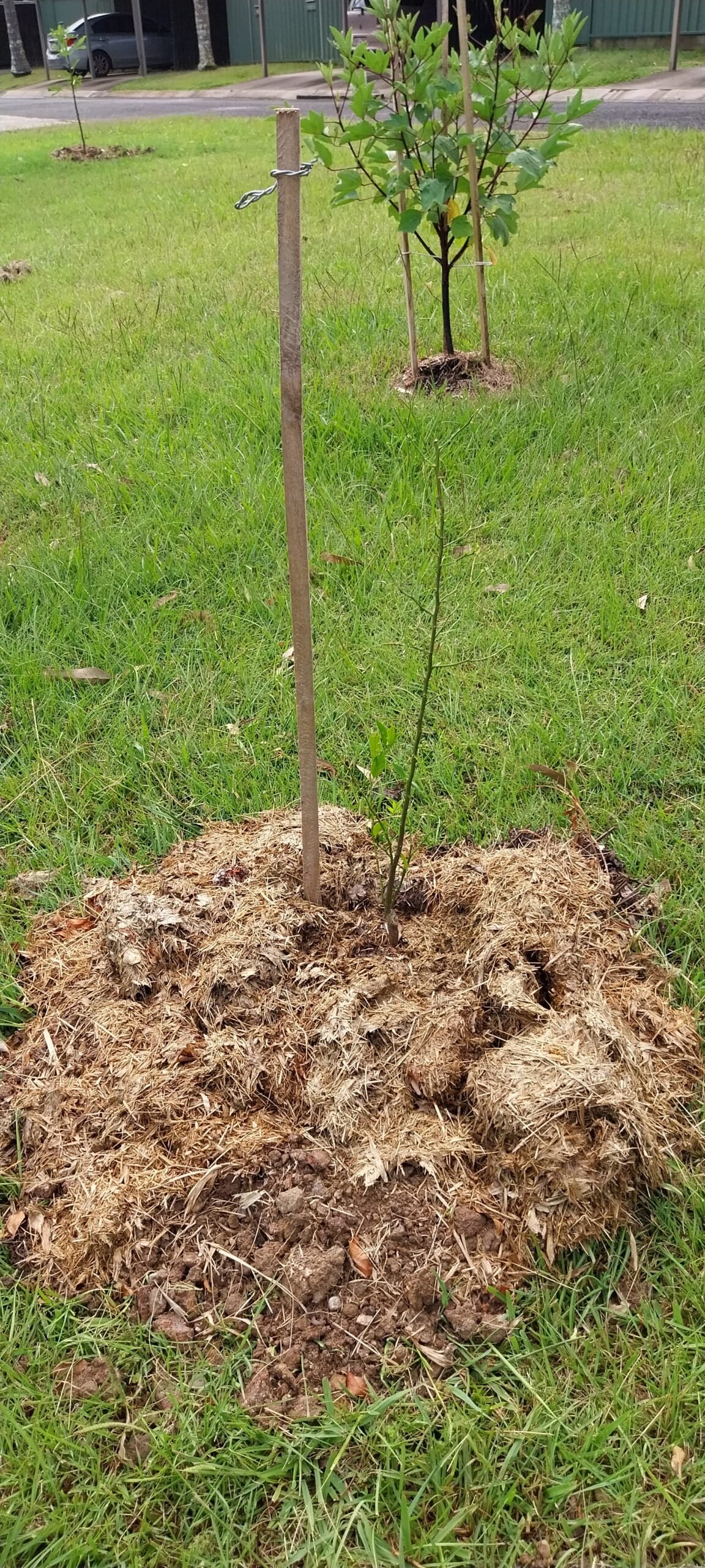 The picture above shows a large pile of grass clippings, terraced so that the water collects in the holes, two of which have just had red paw paws (papaya) planted in them. The hole is much deeper that required and is filled with mulch, manure, dead cane toads and grass clippings. All that is well below the roots of the young plant and will attract insects and worms that help break up the clay in which the hole is dug. That clay will help break up the grass clippings and allow water and air to permeate the mix. Shaping the pile into four “swales” terraced scoops, encourages the water to collect around the roots of the plant and run across the original surface of the ground, under the mulch. This helps accelerate the rotting of the grass, and allows the water to soak into the ground.