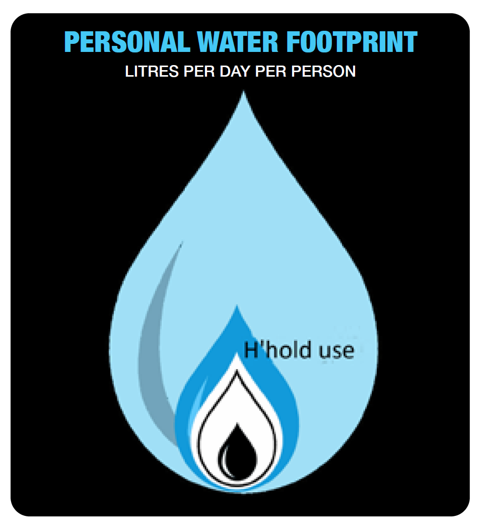 The Personal water target refers to the per capita use of water in the household, because that is the number publicised during droughts. The total water footprint is used to consider the impact of food choices on the water footprint of an individual.